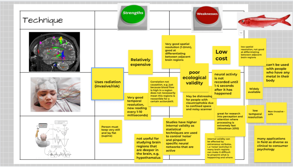 Suitable techniques include MRI, fMRI and PET imaging but what is important is that you understand how they are used by psychologists to study the relationship between brain and behaviour (remember the IB accept cognitive processes, such as memory, as a behaviour).