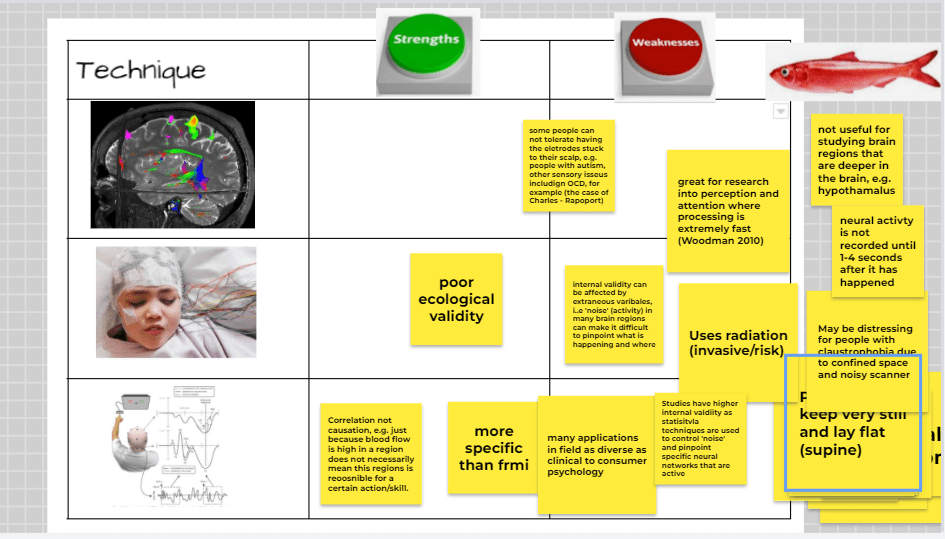 Discussing fMRI: Revise Broca’s area, (place the blob in the correct hemisphere, name the lobe), use the blood droplet to discuss the fact that more oxygenated blood will be required in this location and how the fMRI measures this (refers to BOLD contrast) show the area ‘lighting up’ on the scan (use warm colours for active areas and cool colours for inactive areas). Lots and lots of sticky notes to sort into strengths and weaknesses of fMRI, EEG and ERP. Change the colour of the stickies (green for strength and orange for weakness). There is one red herring which is not true of any of the techniques, place the fish on the red herring!Revising specialist terminology associated with fMRI, EEG and ERP, students can add more stickies if they can think of more specialist terms! Change the sticky colour to match the technique that they are related to. Place the tortoise and the hare on the techniques that have excellent temporal resolution (hare) and poor temporal resolution (tortoise). Place the accurate map on the technique with strong spatial resolution and the poor map on the technique with poor spatial resolution. Join the related words up using the pens (like they are in a neural network) discuss how the concepts are stored within semantic webs of associative memory, firing in one area of the network should trigger therm to think of all the related words.